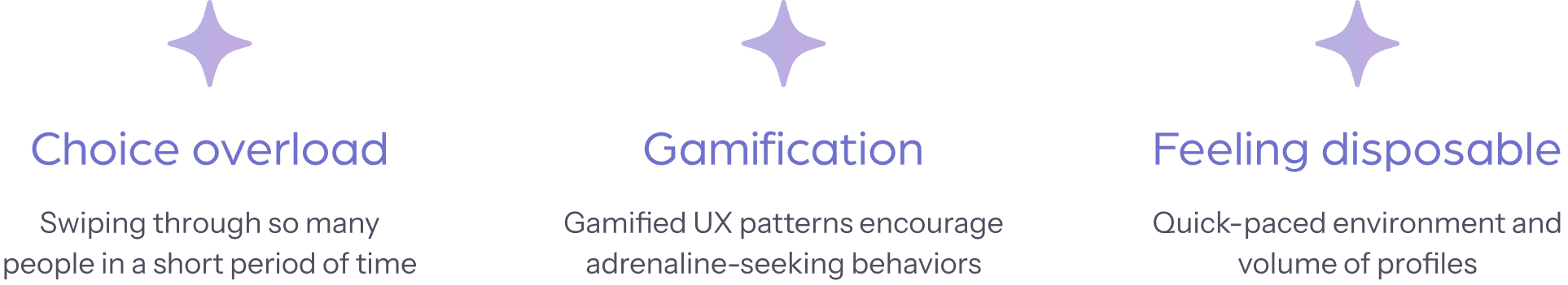 There are many popular dating apps in the market today–to make Facets an app that encourages genuine connections and put an end to the endless scrolling of potential partners, we analyzed a few dating apps to understand their strengths and weaknesses. We found that Hinge has a guided account creation process and has prompt questions for users to answer that we liked, but it indulges in endless scrolling and some features (likes specific filters) are behind a paywall.