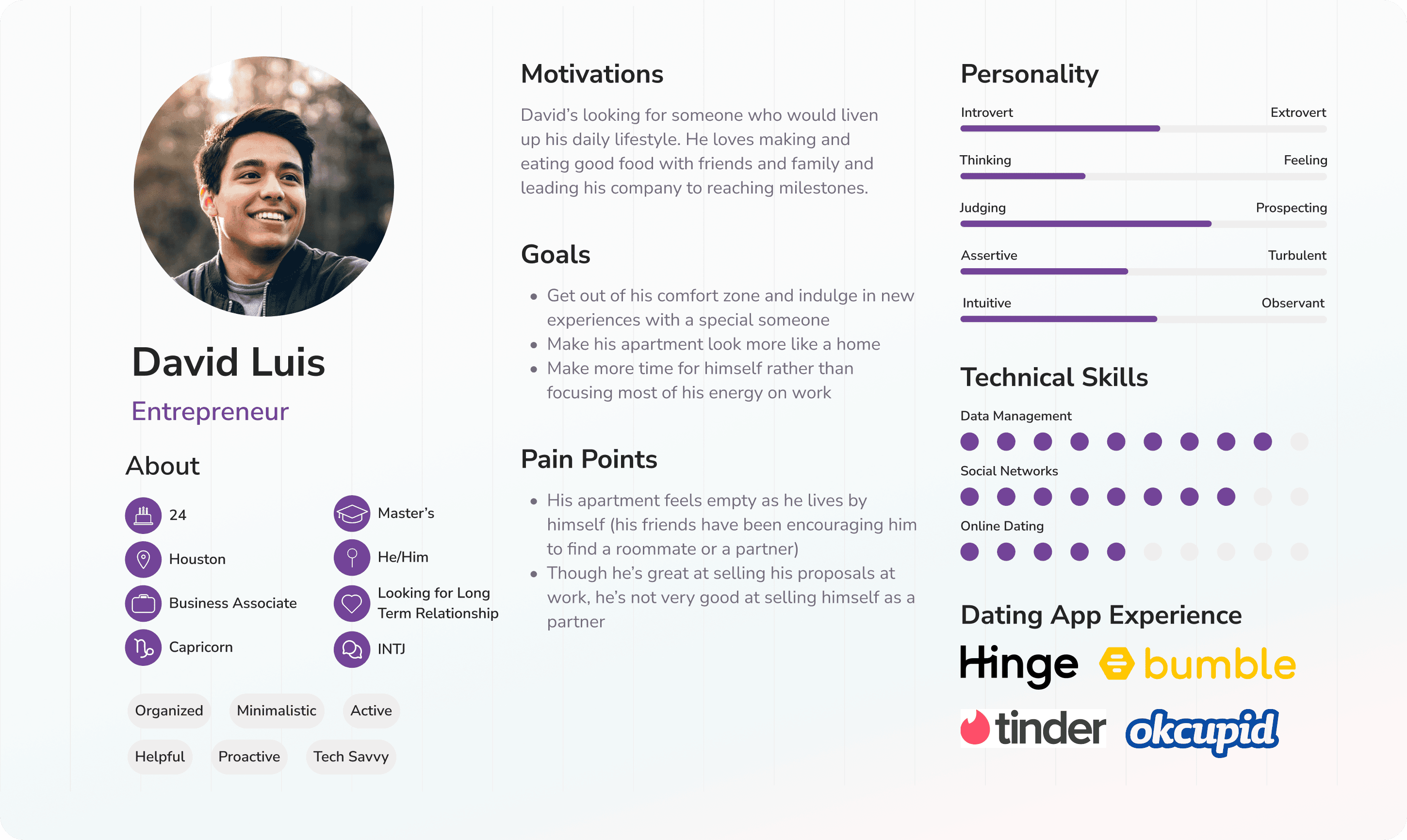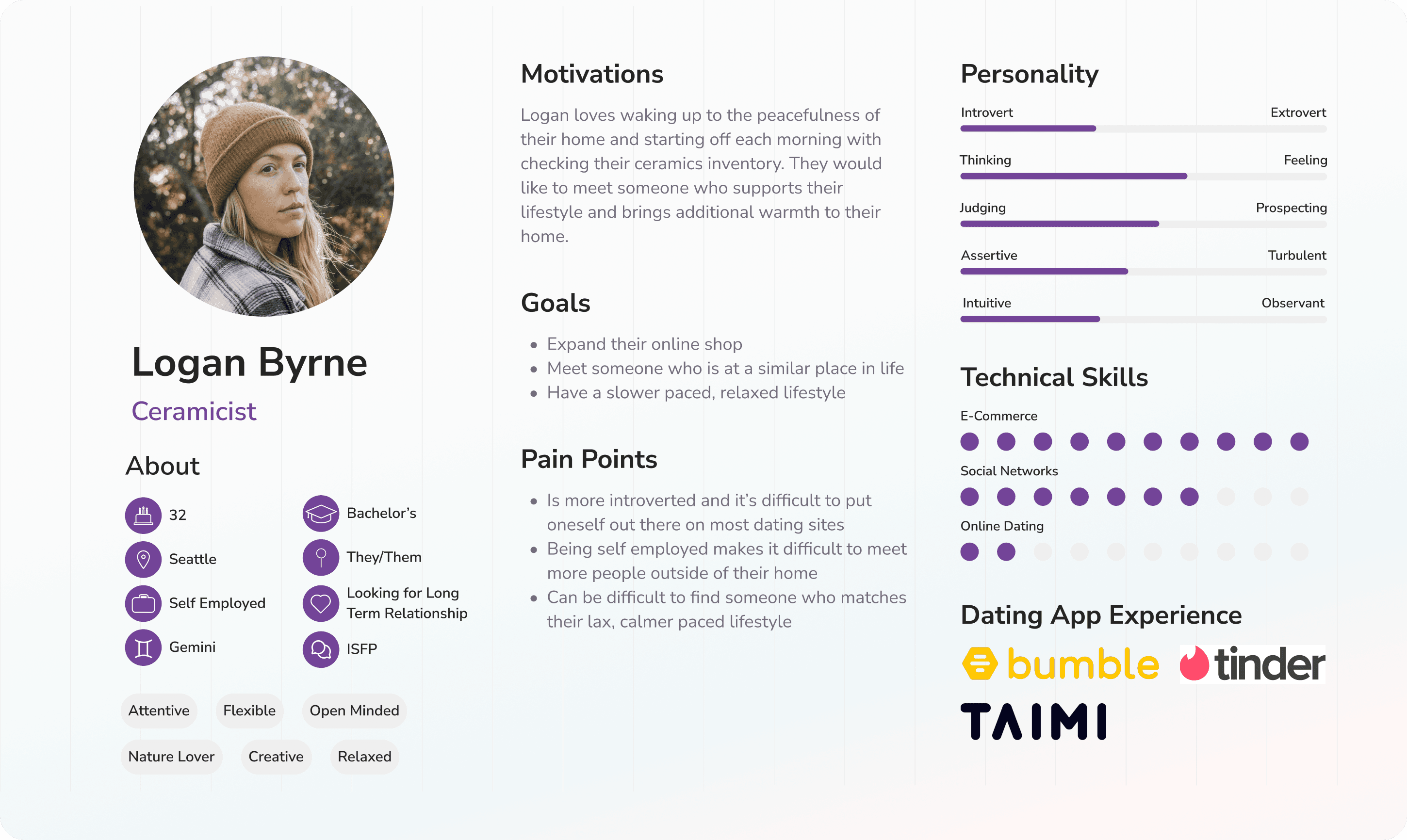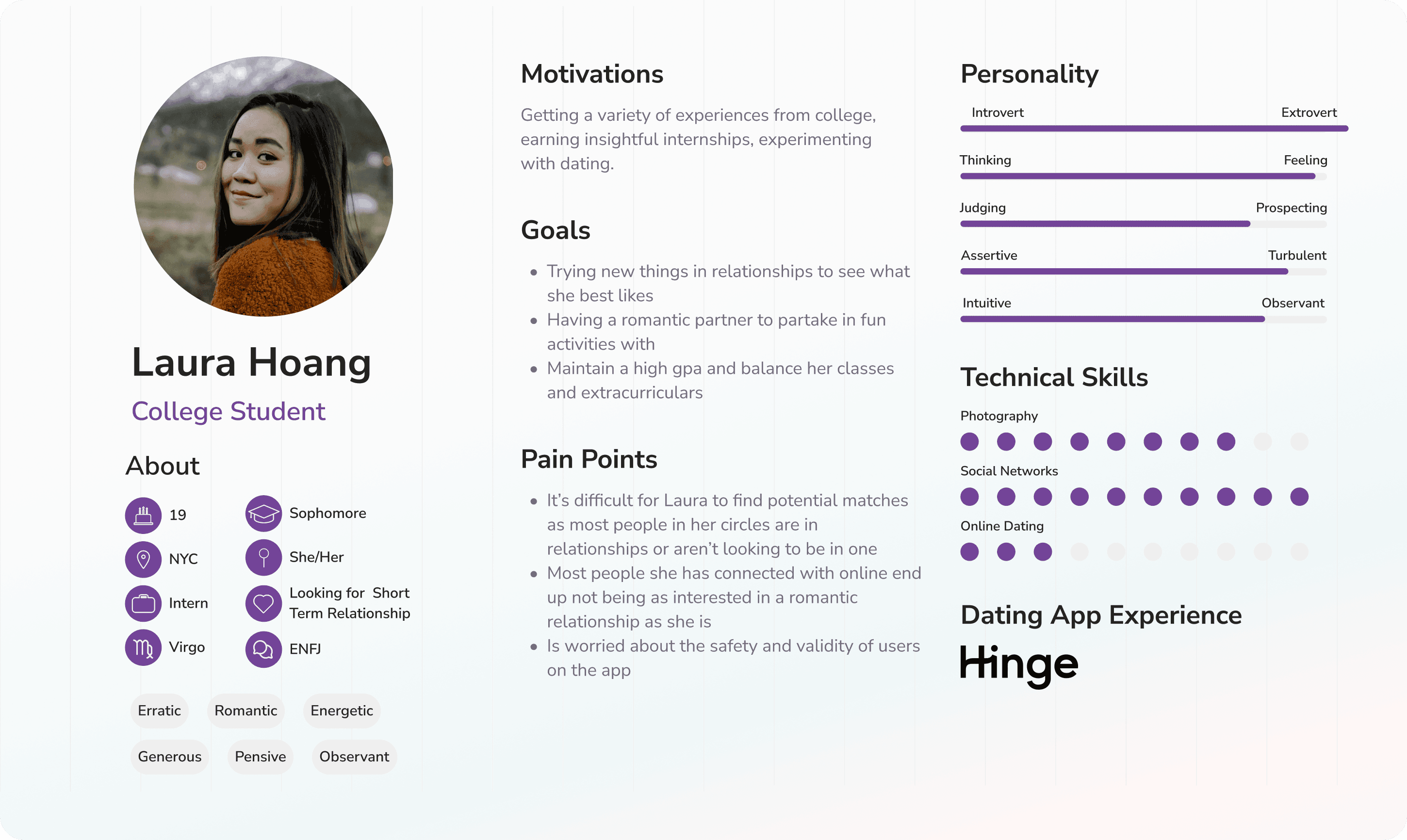 To further understand our users' goals and needs, I created three user personas who align with our target audience but come from different backgrounds and have different expectations when it comes to online dating.