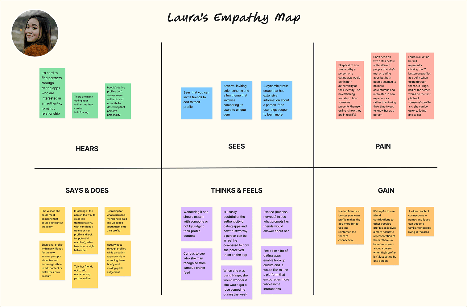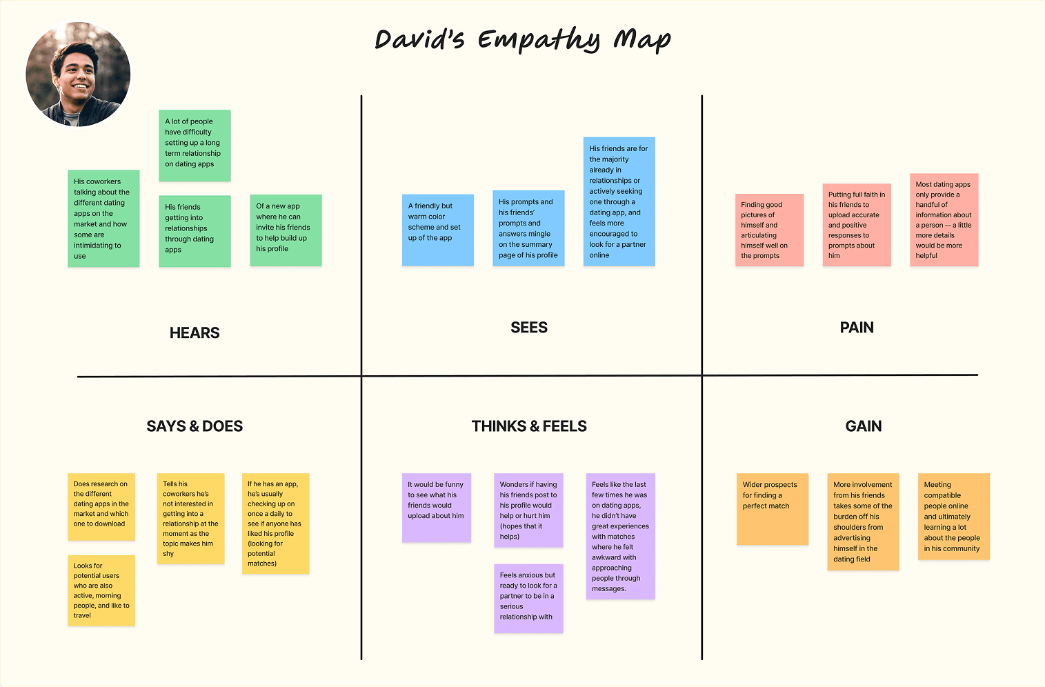 I created two empathy maps (one for David and one for Laura) to note down what they would each hear, see, say/do, think/feel, gain, and would feel pain for with regards to dating apps and also their friends' experiences with relationships and dating apps.