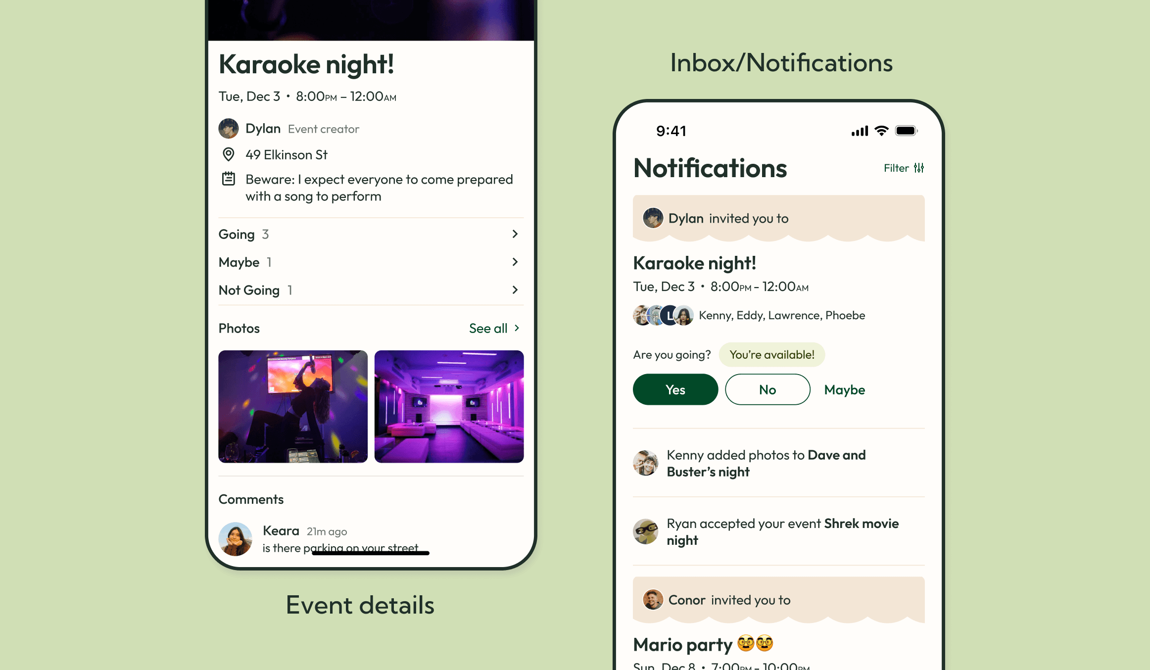 Event invitations can be accessed through both the calendar and the invitations tab in the notifications page. Invitations on the notifications page are sorted into 'Needs response', 'Responded', and 'Your past events' and show the vital information – what the event is, date and time, event owner, and your availability. The expanded invitation allows you to update your RSVP and shows you who's going, any notes from the event owner, the photo album, and a comments section for any discussion about the event.