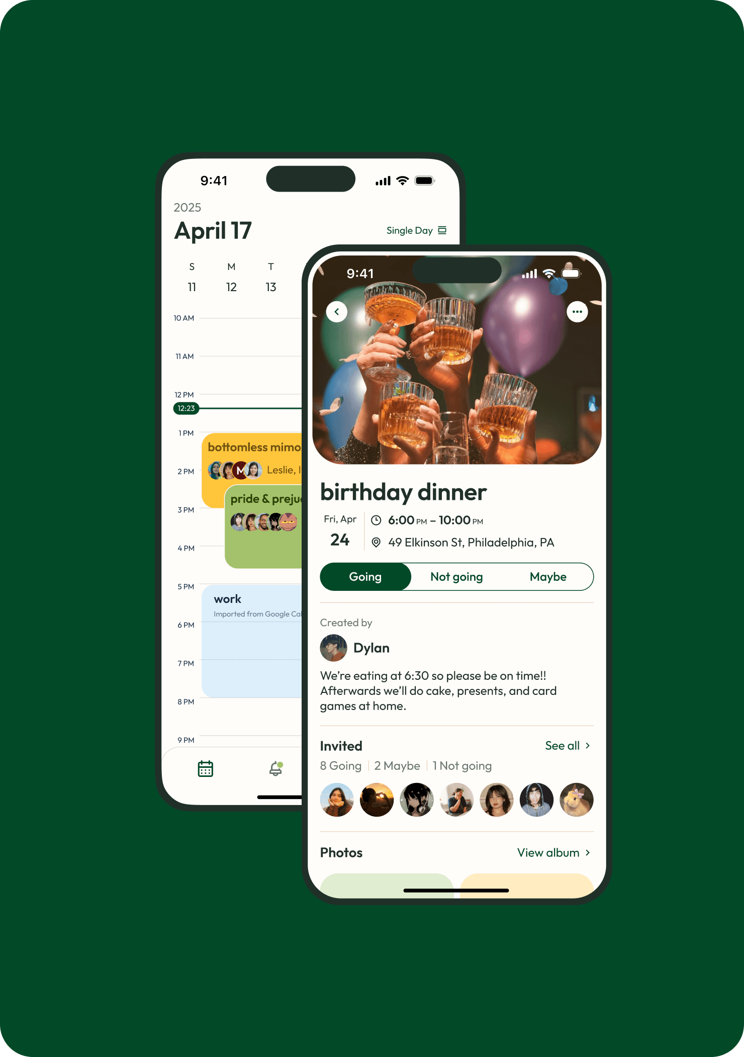 The calendar has three views: single view, three day view, and month view for different viewing experiences. Juncture events reflect your RSVP status and show the most vital information at a glance – including what the event is, who's going, and when it will be.