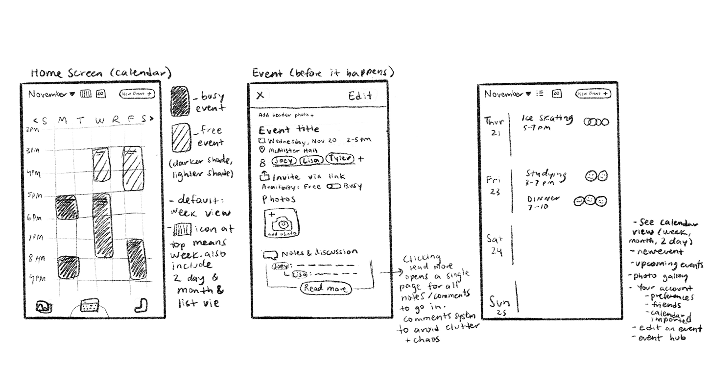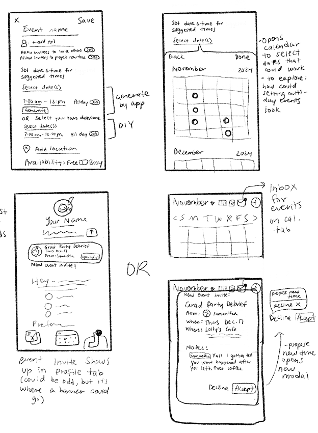 Our main area of focus for the lo-fi prototype was identifying key features and content, mapping out the user flow and laying out the foundation of the app. We also approached designing our core feature: finding the perfect time with our event creation process where users can compare calendar availability.