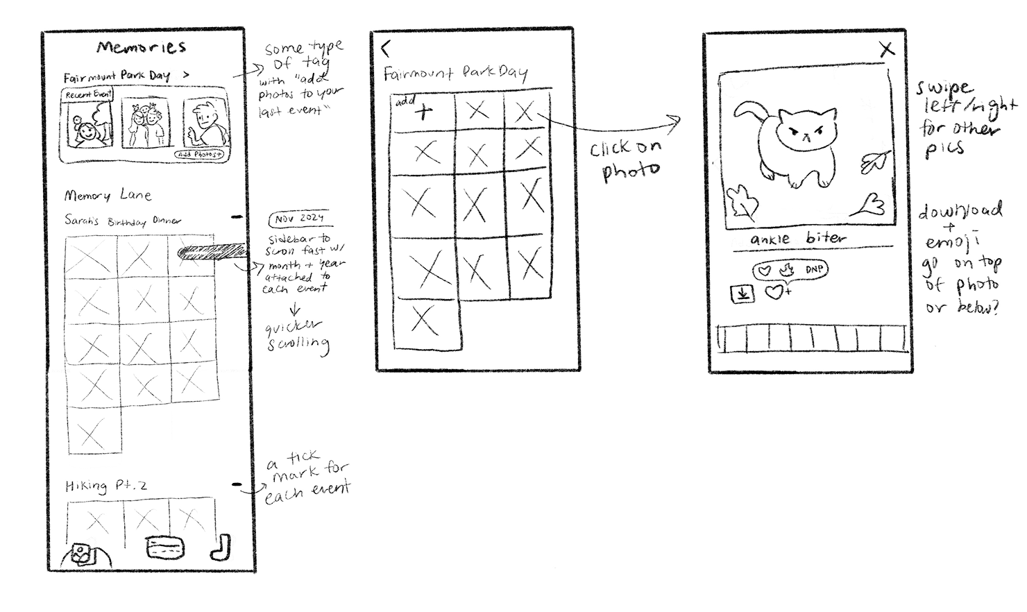 Below are a few sketches I did to visualize my initial ideas for the app. This includes a general layout for the calendar, what content is featured on the event details page, what a profile page could look like, and a high-level flow for viewing event albums.