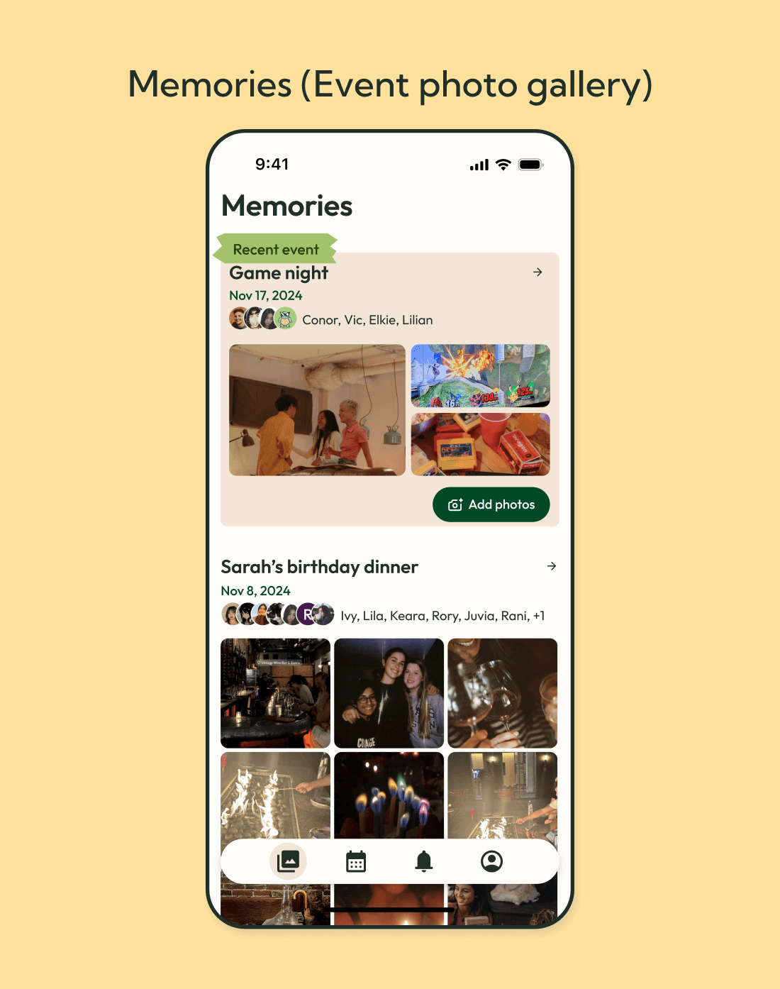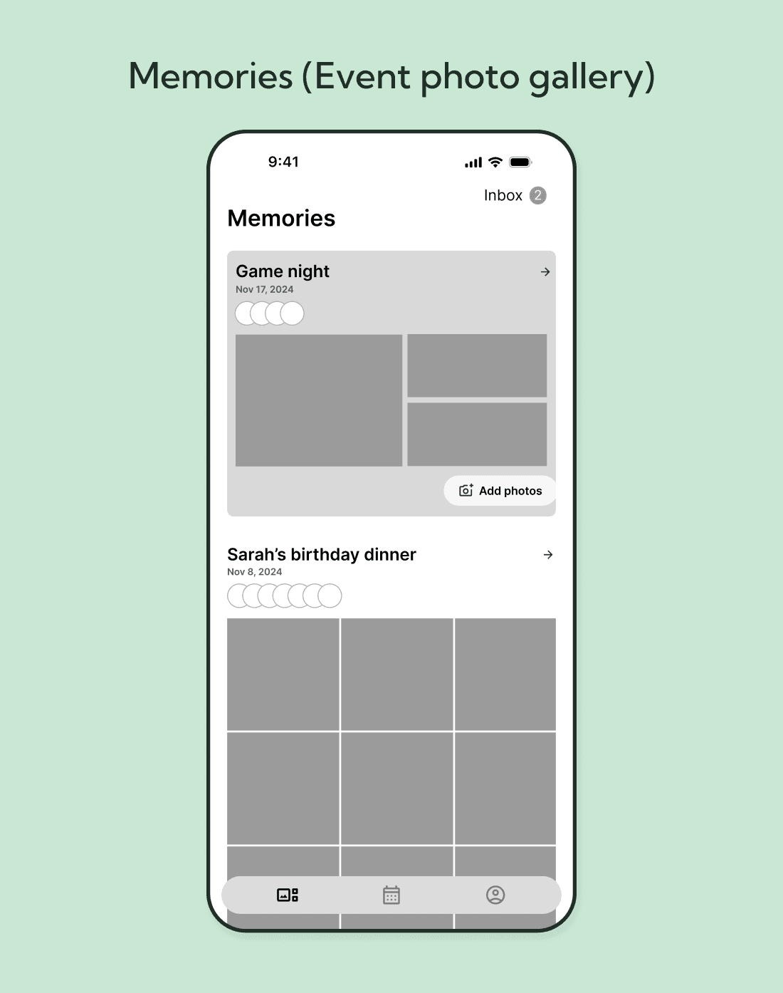 Our research found that most people value sharing and preserving memories. We created a page where Juncture events automatically have a photo album for everyone to upload photos to. A reminder to add photos to the latest hangout sits at the top to encourage every attendee to participate in photo sharing. Photos can be downloaded from the album, and event attendees can type comments to photos for interactive engagement.