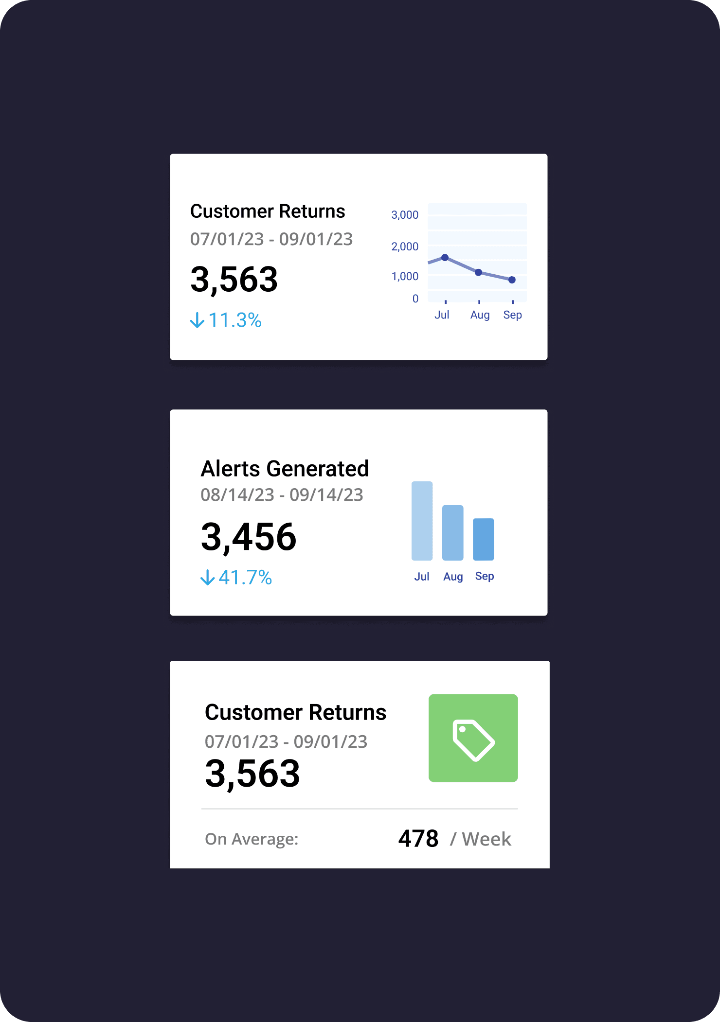 Most KPI widgets display a key metric which will be paired with supplemental info (like an increase or decrease value) to learn about the metric's impact
